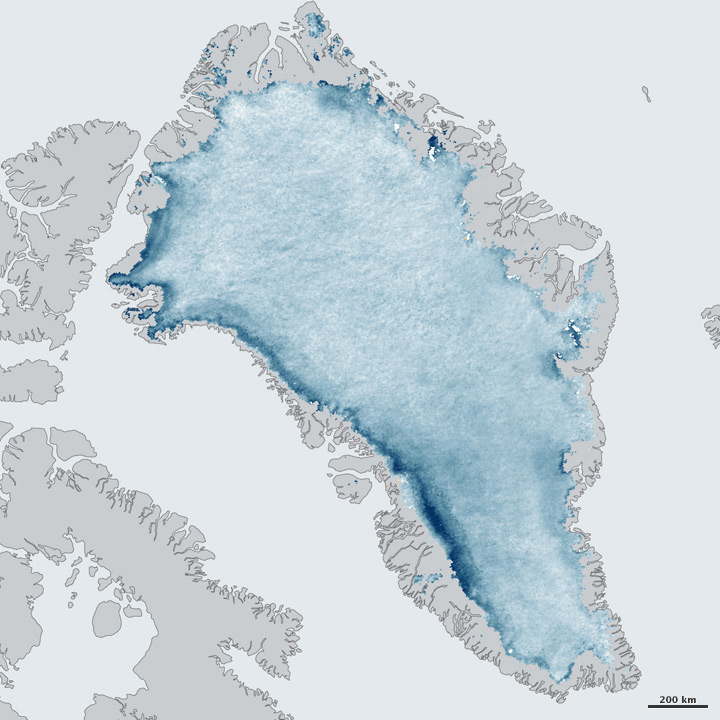The map above shows the difference between the amount of sunlight Greenland reflected in the summer of 2011 versus the average percent it reflected between 2000 to 2006. Virtually the entire ice sheet shows some change, with some areas reflecting close to 20 percent less light than a decade ago. The map is based on observations from the Moderate Resolution Imaging Spectroradiometer (MODIS) instruments on NASA’s Terra and Aqua satellites. It was produced as part of the National Oceanic and Atmospheric Administration’s Arctic Report Card."
