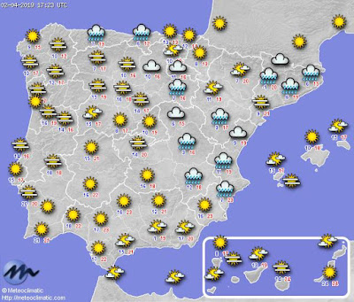 Mapa de Eumetsat de ésta tarde. Se aprecia la mayor nubosidad en la mitad Este. Destaco la nubosidad globular sobre las Islas Británicas que indica el contenido de aire frío que se desplaza de Norte a Sur. Acabará afectándonos.